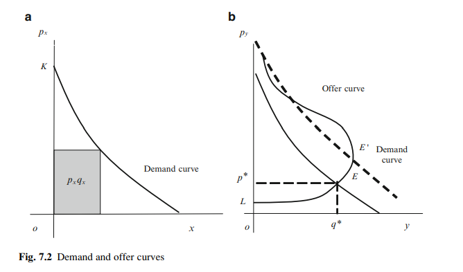 The demand curve, which we present in Fig. 7.2a, at the same time, implicitly includes an offer curve. The idea is that, in an economy of two goods x and y the price of good x is the reciprocal of the price of good y, and vice versa, that is px =1/py and py =1/px. The demand for the good x is a function of the price of good y. If the price of good x in terms of y is high, for example, at a price such as at point K of Fig. 7.2a, then none would be willing to buy (that is to offer quantities of good y). Consequently, at point K, the demand for x is zero and consequently the supply of y will be zero, point L in Fig. 7.2b. As the price of x falls, individuals buy more units of good x, which means that they would be willing and able to offer the required units of good y. When the price of x tends to zero, then the offer of good y tends to zero, since good x can be obtained at no cost. The offer curve of good y becomes asymptotic to the axis of prices. As a consequence, when we know the demand for one good, we essentially know the offer curve of the other good.12 The demand for x entails the offered quantity of good y. The individual out of his total endowment of good y offers a portion of it, in order to obtain a portion of good x. This offered quantity of good y is estimated as the product of the price of x times the quantity demanded (pxqx), in terms of Fig. 7.2a, it will be equal to the shaded rectangle. Consequently, the offer of good y is equal to the area found under the demand curve for each particular price of good x.