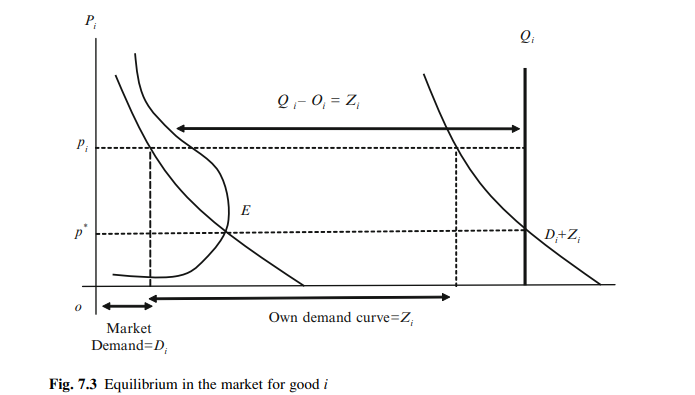 Where, Qi is the total endowments of good i, Zi the own demand which is a function of price and Oi the total offer which is also a function of price (Fig. 7.3). Suppose now that the price is pi, the own demand is Zi and the market demand is Di. Thus, we could draw an own-demand function, that is, the difference between the offer function and the fixed endowment (see Fig. 7.3). In this analysis what is important is the market demand, that is, the total demand for the commodity of all the individuals in the economy, regardless of whether they offer the good i for exchange or retain a portion of it for their own use. In other words, the total demand is the horizontal summation of all market demand curves (Di) as well as of all own demands (Zi). The total demand curve for good i intersects the total fixed endowment at the same price p* which is determined by the intersection of the individual demand and the individual offer curves. The reason is that only at p* is the total demand of all individuals in the market, that is Di þ Zi, equal to the total endowment of good (Qi). According to this approach we start with the behaviour of individuals and investigate the way in which each individual reacts to prices. We continue by forming the demand and offer curves for each particular individual. If we add up horizontally the demand and offer curves of all individuals, we determine the equilibrium prices and quantities through the equality of offer and demand curves. When we add up these offer curves for the economy as a whole, we arrive at the equilibrium prices.