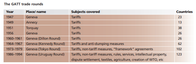 For almost half a century, the GATT’s basic legal principles remained much as they were in 1948. There were additions in the form of a section on development added in the 1960s and “plurilateral” agreements (i.e. with voluntary membership) in the 1970s, and efforts to reduce tariffs further continued. Much of this was achieved through a series of multilateral negotiations known as “trade rounds” — the biggest leaps forward in international trade liberalization have come through these rounds which were held under GATT’s auspices.