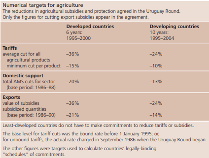 • market access: substantial reductions • exports subsidies: reductions of, with a view to phasing out, all forms of these (in the 1 August 2004 “framework” members agreed to eliminate export subsidies by a date to be negotiated)