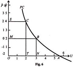 The PC curve in Figure 6 is the Phillips curve which relates percentage change in money wage rate (W) on the vertical axis with the rate of unemployment (U) on the horizontal axis. The curve is convex to the origin which shows that the percentage change in money wages rises with decrease in the employment rate. In the figure, when the money wage rate is 2 per cent, the unemployment rate is 3 per cent. But when the wage rate is high at 4 per cent, the unemployment rate is low at 2 per cent. Thus there is a trade-off between the rate of change in money wage and the rate of unemployment. This means that when the wage rate is high the unemployment rate is low and vice versa.