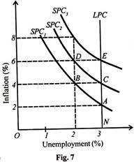 As soon as they adjust their expectations to the new situation of 6 per cent inflation, the short-run Phillips curve shifts up again to SPC3 and the unemployment will rise back to its natural level of 3 per cent at point E. If points A, C and E are connected, they trace out a vertical long-run Phillips curve LPC at the natural rate of unemployment.On this curve, there is no trade-off between unemployment and inflation. Rather, any one of several rates of inflation at points A, C and E is compatible with the natural unemployment rate of 3 per cent.