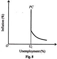 Thus Tobin’s Phillips curve is kinked-shaped, a part like a normal Phillips curve and the rest vertical, as shown in Figure 8. In the figure, Uc is the critical rate of unemployment at which the Phillips curve becomes vertical where there is no trade-off between unemployment and inflation. According to Tobin, the vertical portion of the curve is not due to increase in the demand for more wages but emerges from imperfections of the labour market.