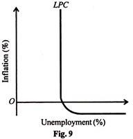 But at a particular level of unemployment when the demand for labour increases, wages rise in the face of expected inflation. But since the Phillips curve LPC becomes vertical at that minimum level of unemployment, there is no trade-off between unemployment and inflation.