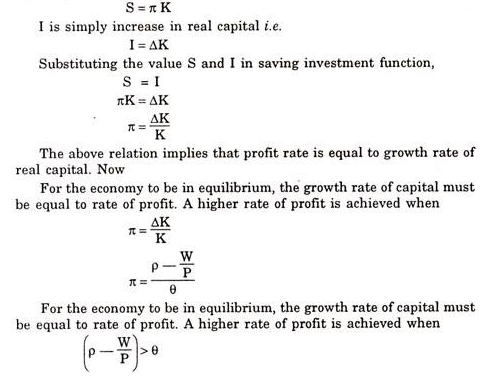 The above equation illustrates that the rate of growth of capital is capable of increasing if the net returns to capital rise in greater proportion than the capital-labour ratio and vice-versa. In other words, lower rate of profit always affects the supply of capital adversely which in turn widens the gap between supply of capital and labour. The main feature of the model is that the rate of growth of capital is dependent on profit rate.
