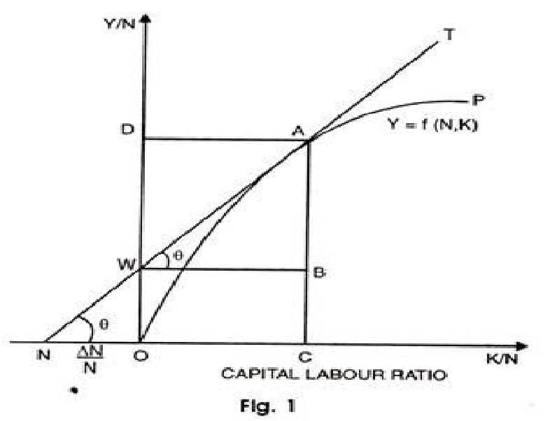 Tangent NT touches the curve OP at A and intersects Y-axis at W. At point A capital labour ratio is OC, the productivity of labour is OD and out of which OW is the wage rate. The surplus DW is rate of return to capital.