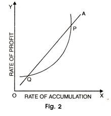 The curve A gives the rate of profit as a function of the rate of accumulation that gives rise to it. The curve 2 shows the rate of accumulation as a function of rate of profit that induces it. The two curves intersect at point P and Q. When the firms operate in the region lying to the right of the point P, the rate of accumulation exceeds the rate of profit.