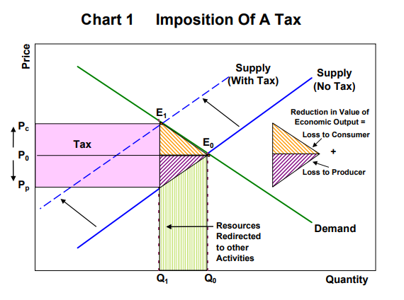 Charting a simple excise tax Consider the imposition of a selective excise tax, such as the cigarette tax or the gasoline tax (see Chart 1). In the absence of the tax, supply would equal demand at the equilibrium point Chart 1 Imposition Of A Tax Quantity Price Supply (No Tax) Demand Tax Q0 P0 Q1 Supply (With Tax) Reduction in Value of Economic Output = Loss to Consumer + Loss to Producer Pp Pc Resources Redirected to other Activities E1 E0 E0, with a unit price of P0 and a quantity of Q0 units. Imposing a per unit tax of t=(Pc-Pp) drives a wedge between the price paid by the consumer (Pc) and the price received by the producer (Pp). As the gross price to the buyer is driven up, the quantity demanded shrinks (movement along the demand curve). As the net price received by the seller falls, less is supplied (movement along the supply curve). The quantity of output falls from its original value (Q0) to its new value (Q1). Market equilibrium shifts from E0 to E1. Tax revenue is t x Q1 (the shaded area, unit tax times quantity). Note that the revenue is not equal to t times the original quantity of the product in the absence of the tax; it is t times the reduced output brought about by the tax. In usual parlance, the upper portion of the revenue rectangle, (Pc-P0)xQ1, is considered to be the share of the tax that falls on the consumer, because he now pays a higher tax-inclusive price. The bottom portion of the rectangle, (P0-Pp)xQ1, is considered to be the share of the tax that falls on the producer in the form of a lower net-of-tax price and revenue received for selling the product.