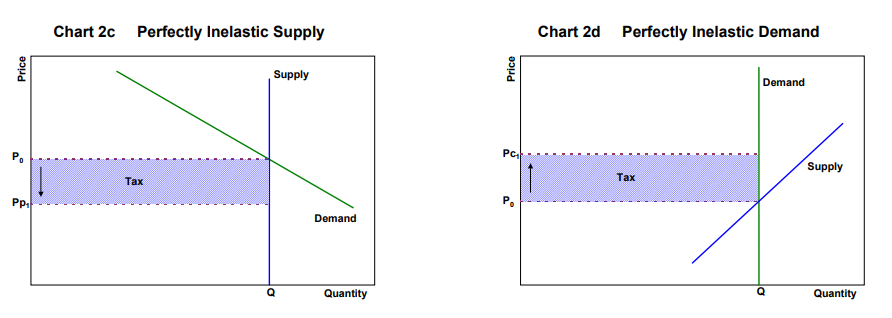 • Perfectly inelastic supply (chart 2c). If supply is perfectly inelastic, the same quantity of product must be offered regardless of the price. (Example: perishable strawberries at a farmers’ market late in the day.) The supply curve is vertical. The price is fixed by demand (what consumers are willing to pay). Any tax imposed will result in a lower net-of-tax price to the seller, who must bear the tax. Output is unchanged. (The strawberries are a short run example. Repeated inability to sell the fruit will result in less being grown next season.)