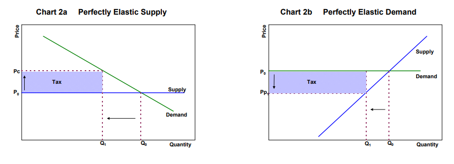 • Perfectly elastic demand (chart 2b). If demand is perfectly elastic, any rise in the price would cause a collapse in consumption. (Example: the demand for beer at one out of twelve concession stands at a stadium. If one stand tries to charge more than the others, it will lose all its business to the other stands.) The demand curve is horizontal, and the market price is fixed. Any tax imposed (on that one beer outlet) will simply lower the net-of-tax price to the producer, who must bear the whole tax. Output will fall if supply is price sensitive.