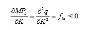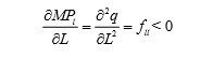 It is reasonable to expect that the marginal product of an input depends on the quantity used of that input. In the above example, use of labour is made keeping the amount of other factors (such as equipments and land) fixed. Continued use of labour would eventually exhibit deterioration in its productivity. Thus, the relationship between labour input and total output can be recorded to show the declining marginal physical productivity. Mathematically, the diminishing marginal physical productivity is assessed through the second-order partial derivative of the production function. Thus, change in labour productivity can be presented as: