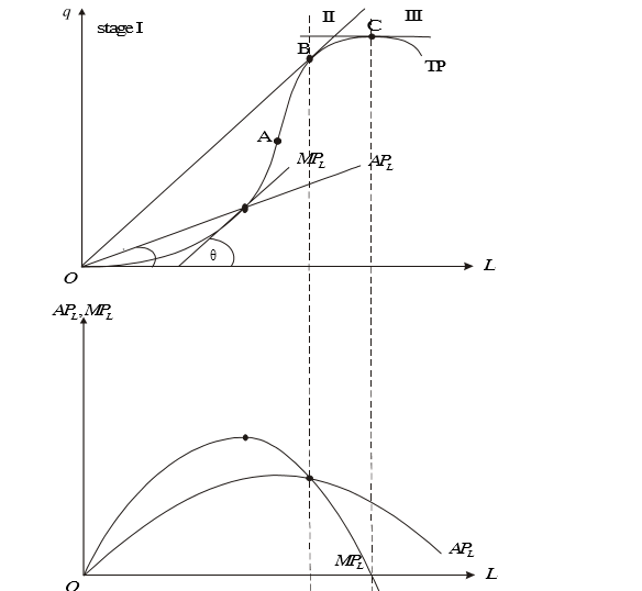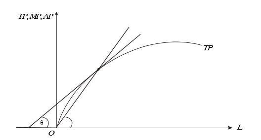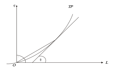 If the TP curve is as shown in the adjacent , then the MPL given by tanθ is throughout less than the APL given by tan