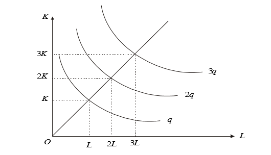 RETURNS TO SCALE It is a typical long-run concept and involves the effect of change in inputs on the quantity of output produced. There are three types of returns to scale. For 1% change in all the factors, if correspondingly, output changes by a) 1%, then there is said to be Constant Returns to Scale (CRS) b) Less than 1%, then there is decreasing Returns to Scale (DRS) c) More than 1%, then there is Increasing Returns to Scale (IRS). Diagrammatic Representation Constant Returns to Scale As there is CRS, along a ray through the origin, the distance between the consecutive iso-quants remains the same