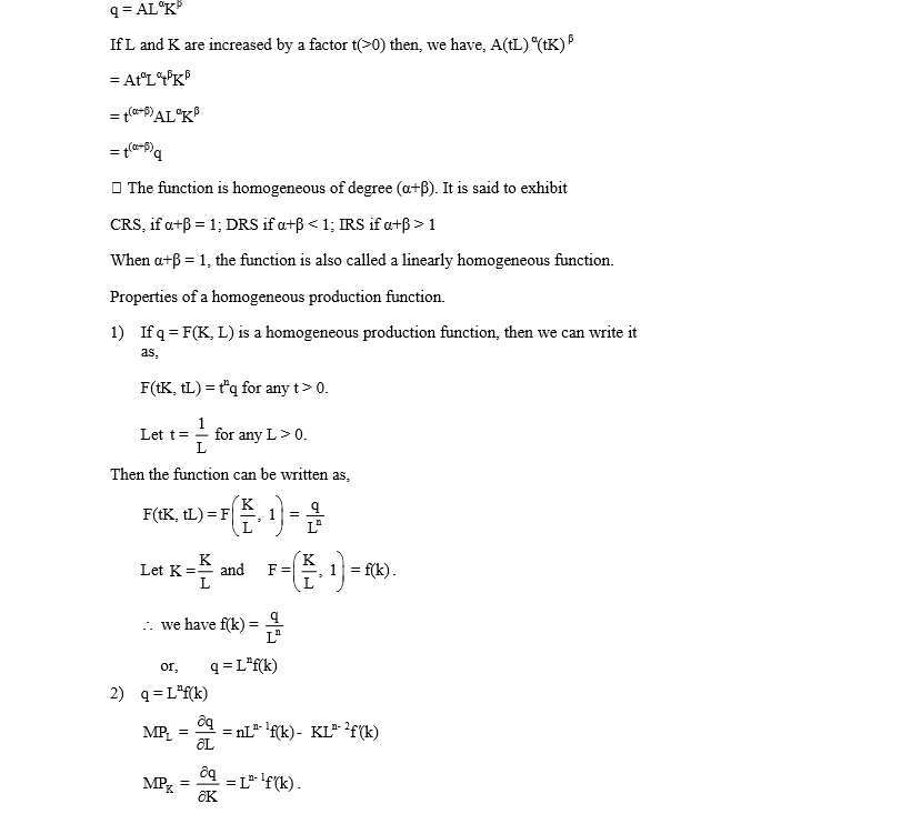 HOMOGENEOUS PRODUCTION FUNCTION The concept of returns to scale can be captured asily using the concept of homogeneity of production functions. A production function say, z = f(x, y) is said to be homogeneous of degree n in x and y, if and only if, f(tx, ty) = tnz for any t > 0. If n = 1, then f(tx, ty) = tz, then the function is said to exhibit CRS. It is also known as a linearly homogeneous production function. If n > 1, then the function exhibits IRS and when n< 1, it exhibits DRS. Example: Suppose we have a production function, If n > 1, then the function exhibits IRS and when n< 1, it exhibits DRS.
