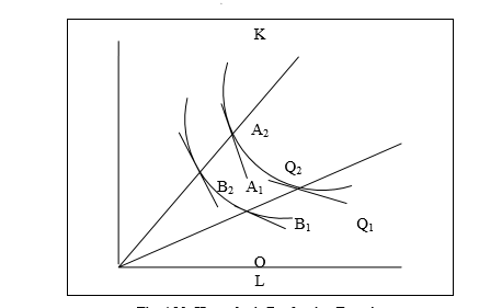 It may be useful to remember that homogenous production function is a special case of homothetic production functions. To take note of the concept, you must look for the ratio MPL/MPK, which does not change with any proportionate change in L and K in case of homothetic production function. The difference this formulation has with that of homogenous production function can be seen from the iso-quants given in Figure. The production function is homothetic if slope of Q1 at A1 = slope of Q2 at A2 and slope of Q1 at B1 = slope of Q1 at B2 In contrast to this feature, the homogenous production function would have