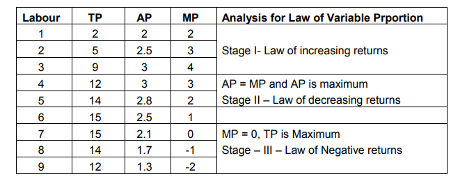 The TP curve is such that upto point A, MP is rising and so is AP and MP > AP, as shown in the diagram below. Beyond point A, MP falls but AP rises, till the two are equated at point B. At B, AP is maximised. AP falls beyond the point B. At point C, the TP curve flattens out and therefore, MP = 0. Beyond C, MP is negative and AP is falling. Therefore, in the case of nonproportional return, both MP and AP rise, initially. MP reaches a maximum earlier than AP. When they both are equated, AP is maximised. Finally, there is a situation where both are falling. Depending on the nature of MP and AP, the production process can be divided into three stages – I, II, and III, as shown in Figure Characteristics of the three stages are :