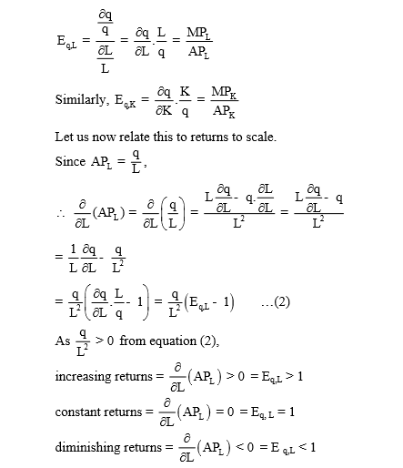 The concept of returns to a factor can also be expressed in terms of the “partial input elasticity of output”. Partial Input Elasticity of Output Partial input elasticity of output is also called elasticity of output with respect to a factor. It is the percentage change in output quantity for one per cent change in the quantity of a factor when all other factors remain constant. Elasticity of q with respect to L is given by,