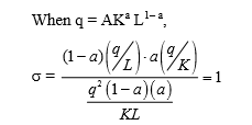 In Cobb-Douglas technology ,the producion function is defined in terms of technology set. Now all the competitive firms use maximum technology in their production functions. if we assume that the parameter is 1 the above equation shows the possible production, quantity of inputs, technology set of any firm. The Cobb-Douglas production function is given by: .....1 where A, a, and b are all positive constants. b=1-a Iso-quants resulting from the functional form have convex shape. The Cobb-Douglas function can exhibit any degree of returns scale depending on the values of a and b. Suppose all inputs were increased by a factor of m. Then, .....2 Hence, in the Cobb-Douglas function • a + b = 1 implies constant returns to scale • a + b > 1 implies increasing returns to scale • a + b < 1 implies decreasing returns-to-scale case. To determine the elasticity of substitution in Cobb-Douglas production function, let us use Allen’s definition ....3 ....4 Note that the Cobb-Douglas function is linear in logarithms, i.e., ln q = ln A + a ln K + b ln L. ...5 As a result, the constant a in (eqn. .5) is the elasticity of output with respect to capital input, and b is the elasticity of output with respect to labour input. To get the result, take ....6 eq,k = a from Equation ..5. Similarly, we get eq,L = b. The characteristics of Cobb- Douglas production function are as follows: i.) Makes it possible to change the algebraic form in log linear form, represented as follows: log Q = log A + a log K + b log L This production function has been estimated with the help of linear regression analysis. ii.)Makes it possible to change the algebraic form in log linear form, represented as follows: log Q = log A + a log K + b log L This production function has been estimated with the help of linear regression analysis. iii.) Acts as a homogeneous production function, whose degree can be calculated by the value obtained after adding values of a and b. If the resultant value of a + b is 1, it implies that the degree of homogeneity is 1 and indicates the constant returns to scale. iv.) Makes use of parameters a and b, which signifies the elasticity’ coefficients of output for inputs, labor and capital, respectively. Output elasticity coefficient refers to the change produced in output due to change in capital while keeping labor at constant. v.) Represents that there would be no production at zero cost. Out of all the production functions used in economics, the most popular production function is the Cobb Douglas production function, also known as the Cobb Douglas function. In economics, the Cobb Douglas form of production functions is widely used to represent the relationship of an output to inputs. Though similar functions were originally used by Knut Wicksell (1851–1926), the Cobb-Douglas form was developed and tested against statistical evidence by Charles Cobb and Paul Douglas. In the 1920s the economist Paul Douglas was working on the problem of relating inputs and output at the national aggregate level. A survey by the National Bureau of Economic Research found that during the decade 1909-1918, the share of output paid to labour was fairly constant at about 74% , despite the fact the capital/labour ratio was not constant. He enquired of his friend Charles Cobb, a mathematician, if any particular production function might account for this. This gave birth to the original Cobb-Douglas production function which they propounded in their 1928 paper, =A Theory of Production‘ The general form of a Cobb Douglas function is stated as where: Q = total production (the monetary value of all goods produced in a year), L = labour input, K = capital input and A = total factor productivity or technology, which is assumed to be a constant. Here α and β are the output elasticities of labour and capital, respectively. These values are constants and are determined by available technology. Output elasticity measures the responsiveness of output to a change in levels of either labour or capital used in production, ceteris paribus. For example if α = 0.15, a 1% increase in labour would lead to approximately a 0.15% increase in output. It is generally said that a strict Cobb Douglas function assumes constant returns to scale as α + β = 1.(since the returns to scale are measured mathematically by the coefficient of the production function). Cobb and Douglas were influenced by statistical evidence that appeared to show that labour and capital shares of total output were constant over time in developed countries. However, now many economists doubt whether constancy over time exists. But at your level of understanding, we say that for a Cobb Douglas function, α + β = 1 Properties of a Cobb-Douglass function 1). Cobb Douglas function is linearly homogenous of degree one. This means that when input is increased by λ, output also increases by λ. 2) Average products of capital and labour can be expressed in terms of ratios of inputs. Average product of labour can be obtained by dividing the production by the amount of labour Thus we have shown that the APL can be expressed as the raion of the two inputs K and L Similarly 3). Marginal product of capital and labour can be expressed in terms of ratios of inputs. Thus the marginal product of capital (MPK) can be expressed in terms of ratios of inputs L and K. It is also equal to β times APK. That is, Similarly the marginal product of capital (MPL) can be expressed in terms of ratios of inputs L and K. Symbolically It is also equal to α times APL. That is 4. Cobb Douglasfunction satisfies Euler‘s theorem. 5. Elasticity of substitution of a Cobb Douglasfunction is unity*. (*The elasticity of substitution was introduced independently by John Hicks (1932) and Joan Robinson (1933) to measure the degree of substitutability between any pair of factors. Elasticity of substitution is the elasticity of the ratio of two inputs to a production function with respect to the ratio of thei
