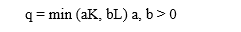 where the operator “min” indicates that q is given by the smaller of the two values in parentheses. See that in this formulation capital and labour are used in a fixed ratio. Consequently, its iso-quants are L-shaped.A firm characterised by this production function will always operate along the ray where the ratio K/L is fixed at b/a and any point of operation other than at the vertex of the iso-quants would be inefficient. Because K/L is a constant, it is easy to see from the definition of the elasticity of substitution that σ must equal 0.