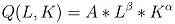 In this formula, Q is the quantity produced from the inputs L and K. L is the amount of labor expended, which is typically expressed in hours. K represents the amount of physical capital input, such as the number of hours for a particular machine, operation, or perhaps factory. A, which appears as a lower case b in some versions of this formula, represents the total factor productivity (TFP) that measures the change in output that isn't the result of the inputs. Typically, this change in TFP is the result of an improvement in efficiency or technology. The Greek characters alpha and beta reflect the output elasticity of the inputs. Output elasticity is the change in the output that results from a change in either labor or physical capital.