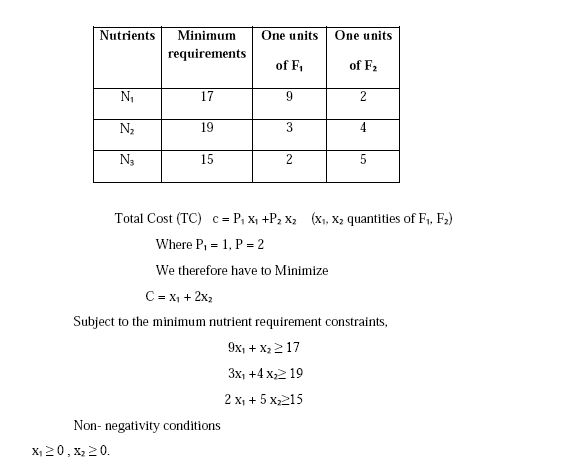 Example: Two foods F1, F2 are available at the prices of Rs. 1 and Rs. 2 per unit respectively. N1, N2, N3 are essential for an individual. The table gives these minimum requirements and nutrients available from one unit of each of F1, F2. The question is of minimizing cost (C), while satisfying these requirements