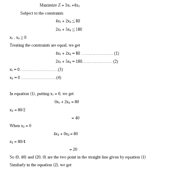 1. Formulate the problem in to LPP. 2. Each inequality in the constraint may be treated as equality. 3. Draw the straight line corresponding to equation obtained steps (2) so there will be as many straight lines, as there are equations. 4. Identify the feasible region. This is the region which satisfies all the constraints in the problem. 5. The feasible region is a many sided figures. The corner point of the figure is to be located and they are coordinate to be measures. 6. Calculate the value of the objective function at each corner point. 7. The solution is given by the coordinate of the corner point which optimizes the objective function. Example: Solve the following LPP graphically.