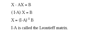 A is the matrix of technical coefficients. To find the level of total output needed to satisfy final demand, we can for X in terms of matrix of technical coefficients and the column vector of final demand.
