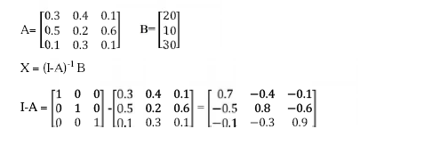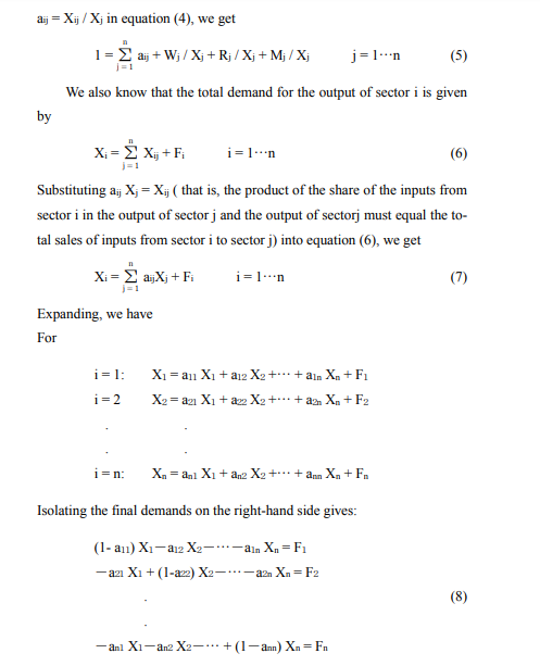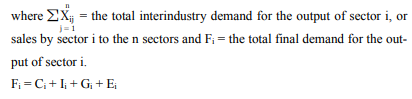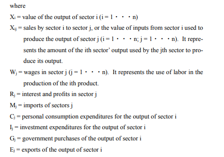 Leontief input-output analysis answers what level of output each of n industries in an economy should produce that will just be sufficient to satisfy the total demand for the product. The total demand x for product i will be the summation of all intermediate demand for the product plus the final demand b for the product arising from consumers, investors, the government and exporters as ultimate users. For example, the output of steel industry is needed as an input in many other industries, or even for that industry itself; therefore the correct level of steel output will depend on the input requirements of all the n industries.in turn the output of many other industries wil enter into the steel industry as inputs, and consequently the “correct” levels of other products will in turn depend partly on the input requirements of the steel industry. In view of inter industry dependence, any set of “correct” output levels for n industries must be one that is consistent withal the input requirements in the economy, so that no bottlenecks will raise anywhere. If aij is a technical coefficient expressing the value of input i required to produce one dollar’s worth of product j the total demand for product i can be expressed as