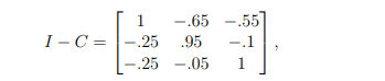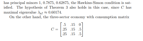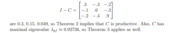 Theorem 3. A nonnegative matrix C is productive if and only if the maximal eigenvalue λpf of C satisfies λpf < 1. To illustrate these three theorems, we shall take some examples of threesector economies. Remember that this is just for illustration, since any realistic input-output model has hundreds of sectors. First consider the economy with consumption matrix