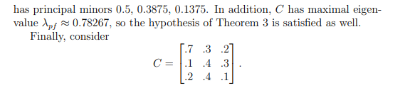 This matrix violates the hypothesis of Corollary 2, since sectors 1 and 2 are not profitable. It also doesn’t satisfy the hypothesis of Corollary 1, since the first row sum is 1.2. With some persistence Theorem 1 can still be used to show C productive, since