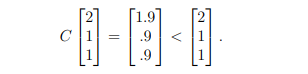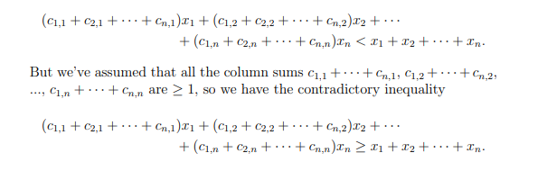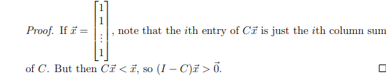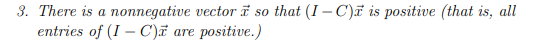 Corollary 4. The nonnegative matrix C cannot be productive if every column sum is 1 or more. To put it another way, an economy cannot be productive if every sector is not profitable. By taking transposes as above we also have the following result.