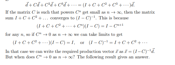 Here is a way to think about this. Suppose the sectors first order inputs C ~d to meet the projected demand ~d. Then they will need to order additional inputs C(C ~d) = C 2 ~d to produce the required C ~d for each other; this leads to a further required input C 3 ~d to produce C 2 ~d, and so forth. The final demand is
