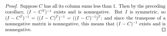 Corollary 2. If the nonnegative matrix C has all its column sums less than 1, then (I − C) −1 exists and is nonnegative.