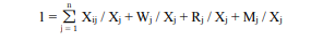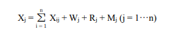 The input-output coefficient, aij,0 to, or contributed by, inputs purchased from sector 1. The input-output coefficients can equal 0, (if no inputs from sector i are used in the production of sector j), but must be less than 1 (if there is value added by labor and capital in the production of the output of sector j). The Wj / Xj, Rj / Xj, and Mj / Xj, indicate the shareas of wages (payments to labor), interest and profits (payments to the owners of capital), and imports (payments to foreigners) in the output of sector j. Substituting