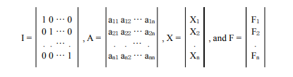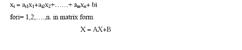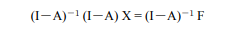 This system of n linear equations in n unknowns (the sectoral outputs,X1, …, Xn), can be written in matrix notation as (I-A) X = F, where I is the n x n identity matrix, A is the nxn matrix of exogenous input-output coefficients, X is the n x 1 matrix (vector) of endogenous sectoral outputs, and F is the n x 1 matrix (vector) of exogenous final demands.