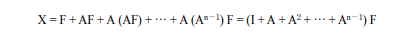 The first component on the right-hand side of equation (10) shows the direct output requirements to meet the final demand vector F. The second component shows the direct output requirement satisfying, in the second round, the intermediate demand vector, AF needed for the production of vector F in the previous round; the third component shows the direct output requirement for the intermediate consumption, A2 F, required for the production of vector AF in the previous round, and so on until the process decays and the sum of the series converges to the multiplier matrix (I- A)-1.