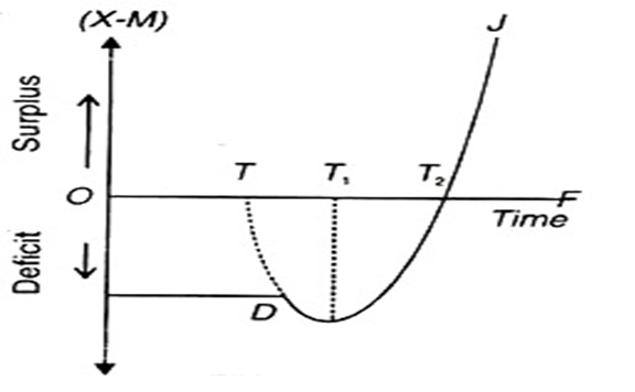 In the beginning, the curve / has a big loop which shows increase in BOP deficit beyond D. It is only after time T1 that it starts sloping upwards and the deficit begins to reduce. At time T2 there is equilibrium in BOP and then the surplus arises from T2 to J. If the Marshall-Lerner condition is not satisfied, in the long run the J-curve will flatten out to F from T2.