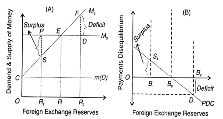 Ms and MD curves intersect at point £ where the country’s balance of payments is in equilibrium and its foreign exchange reserves are OR. In Panel (B) of the figure, PDC is the payments disequilibrium curve which is drawn as the vertical difference between Ms and MD curves of Panel (A). As such, point B0 in Panel (B) corresponds to point E in Panel (A) where there is no disequilibrium of balance of payments.