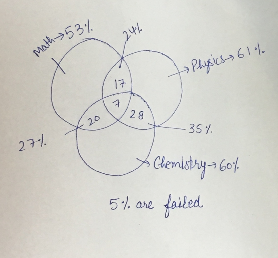 We have a formula:- single values - double values + triple values = Total (61+60+53) - (24+27+35) + T = 95 (100-5)who are failed 174-86+T = 95 T = 7% 20:27 5:7