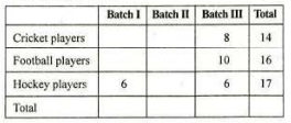 In a school, there are three batches of players, who play cricket, football and hockey. An incomplete chart of number of students playing an individual sport belonging to an individual batch is displayed in the following table:-
