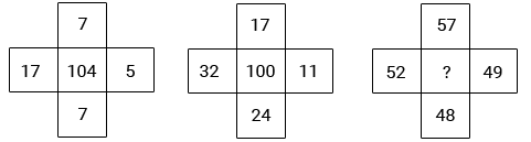 The pattern is: (17-7)2+(7-5)2=104 (32-24)2+(17-11)2=100. So, missing number =(52-48)2+(57-49)2=80