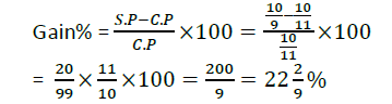 (Since he purchase 110 articles by paying Rs. 100) Again S.P =100/90=10/9 (Since he sells only 90 articles charging the CP of 100 articles).