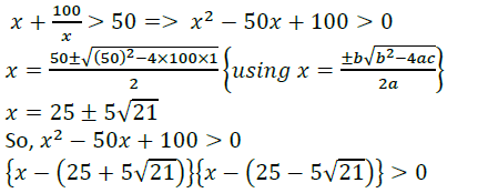 The number of values of x satisfying x+100/x>50, where x is a natural number less than or equal to 100 is