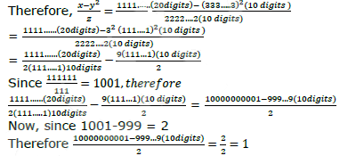 If x = 111…1 (20 digits), y = 333…3 (10 digits) and z = 222…2 (10 digits), then what is( x – y2) / z equal to?