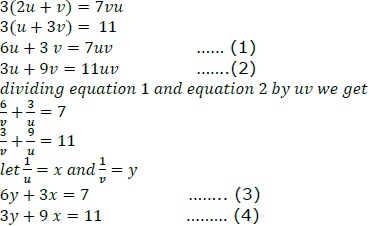 What is the value of ?? in the system of equations 3(2u+v)=7vu,3(u+3v)=11uv?