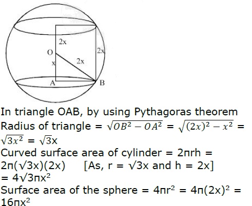 A cylinder of height 2x is circumscribed by a sphere of radius 2x such that the circular ends of the cylinder are two small circles on the sphere. What is the ratio of the curved surface are of the cylinder to the surface area of the sphere?