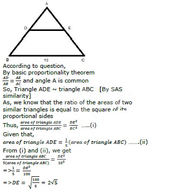 One-fifth of the area of a triangle ABC is cut off by a line DE drawn parallel to BC such that D is on AB and E is on AC. If BC = 10 cm, then what is DE equal to?