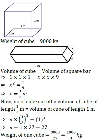 A cubic metre of copper weighing 9000 kg is rolled into a square bar 9 m long. An exact cube is cut off from the bar. How much does the cube weigh?