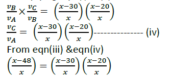 x2– 48x = x2 + 600 – 50x 2x = 600 ⇒ x = 300 Putting x = 300 in equation (i) & eq (ii) ⇒vB/vA=(300−20)/300=270/300=9/10 ⇒vB=(9/10)vA ---------------- (v) ⇒vC/vB=(300−20)/300 =280/300=28/30 vC=28/30vB=28/30×9/10 vA=84/100vA -------- (vi) From eq (v) 7 eq (vi)- vA: vB: vC = vA (:9/10)vA:(84/100)vA = 100: 90: 84 = 50: 45: 42