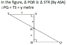 Two poles are placed at P and Q on either side of a road such that the line joining P and Q is perpendicular to the length of the road. A person moves x metre away from P parallel to the road and places another pole at R. Then the person moves further x metre in the same direction and turns and
